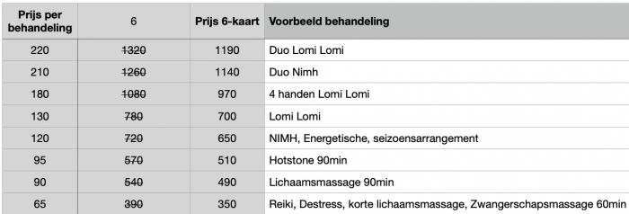 De 6 (massages) beurten kaart.Het leven wordt duurder, ook voor ons, en dus ook onze tarieven.